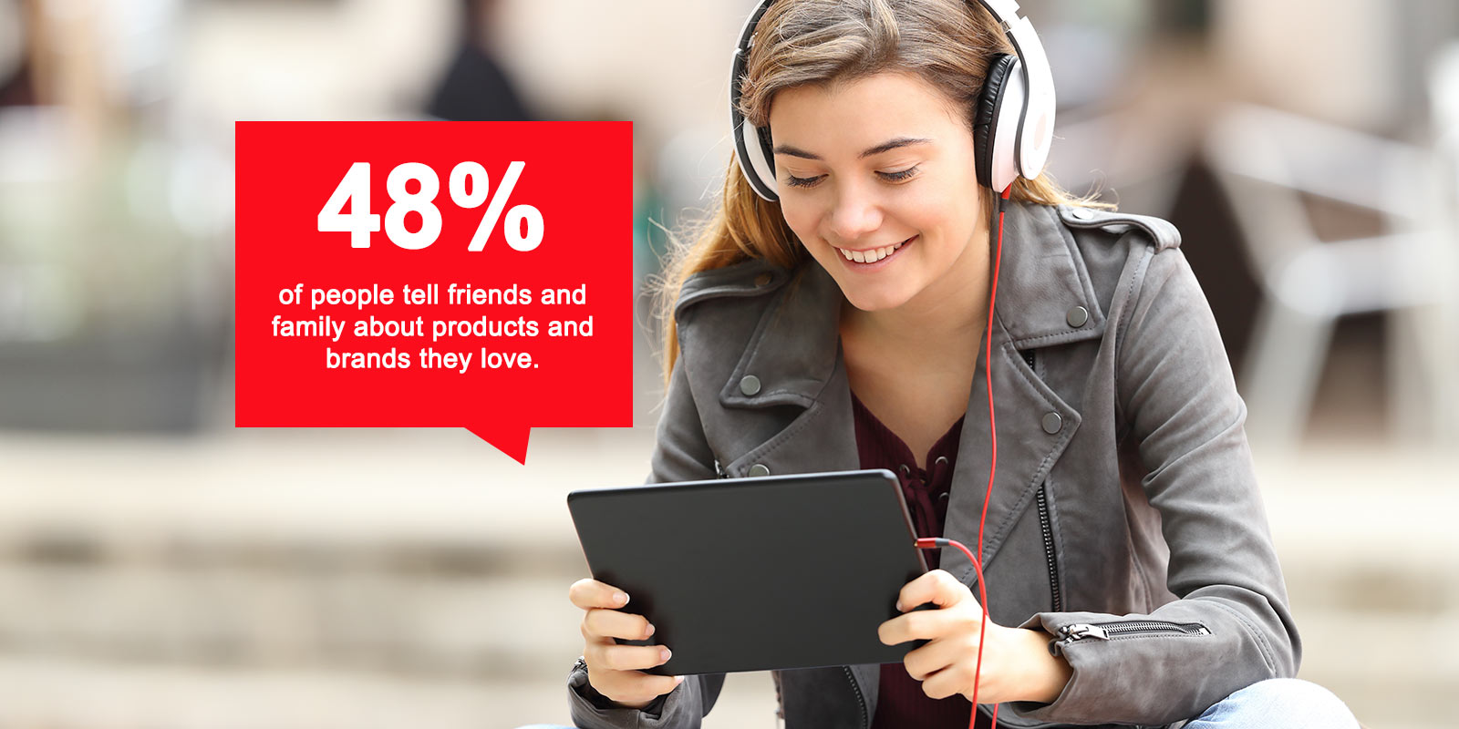 of people tell friends and family about products and brands they love, and about online content related to these.